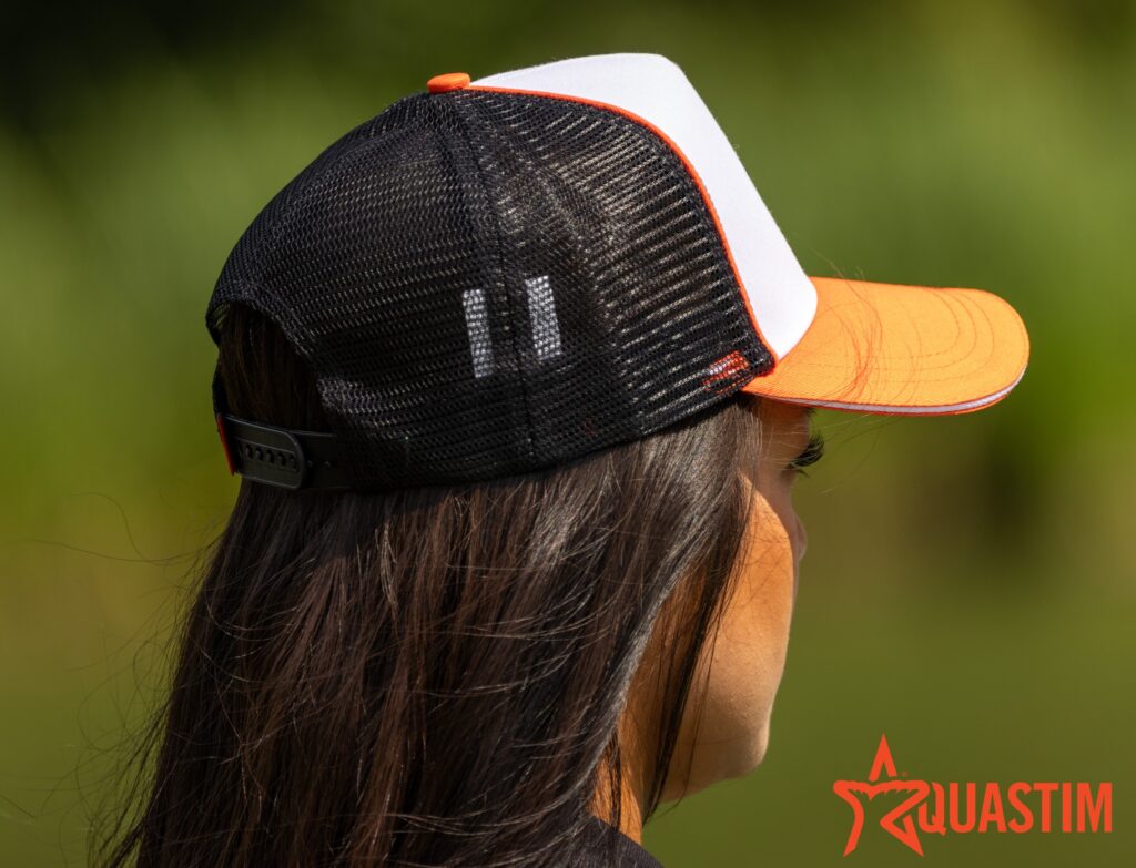 The cap features a full 3D-embroidered Aquastim logo across the front and the instantly recognisable, abbreviated Aquastim logo on the peak, along with a contrasting orange rim and orange eyelets.
