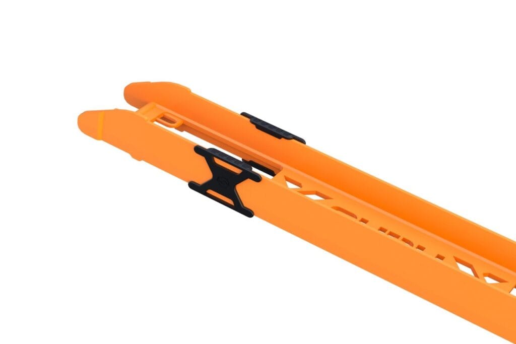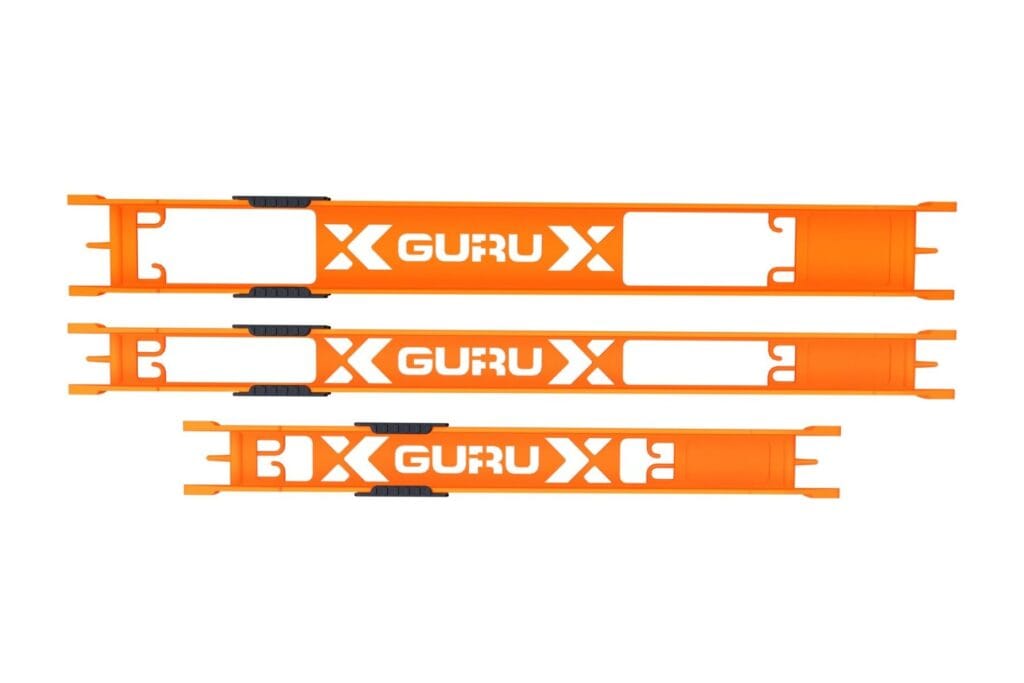 For the ‘pole’ end of the rig, there is an adjustable ‘slide’ hookup which can be used with loops or simply to trap the line if the depth hasn’t’ been decided. Again, featuring rounded plastic to hold a loop and is fully adjustable up the length of the winder to suit and store any length rig without the need of a pole anchor. They are finished off with minimalistic but super-strong center pieces in a slick Guru design, that makes the Winders easy to air/dry thanks to lots of ventilation points. There is a flat area so you can place a sticker or write on what components the rig features. Stickers for this are included and fit perfectly. The smart and bright orange Guru colour means you can easily see them when dropped too. Size wise, we have three options to cater for most needs – a 190mm Slim version, with 260mm Slim and Wide versions for anglers storing bigger bodied floats.