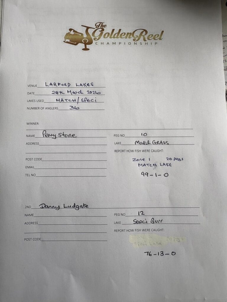 The 2026 Golden Reel campaign began on Saturday, 28th March at Larford Lakes, where the opening qualifier produced two finalists under the new format. A total of 36 anglers competed across the Match and Specimen lakes. The field was split into two zones, with one qualifier progressing from each section. As a result, Perry Stone and Danny Ludgate secured the first places in this year’s £25,000 Grand Final.