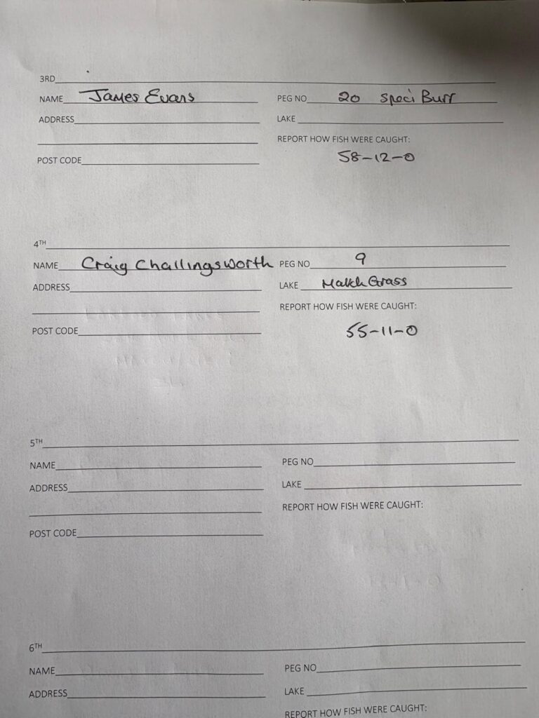 Behind the two qualifiers, James Evans finished third with 58lb 12oz from peg 20 on Specimen Burr. Craig Challingsworth followed in fourth place with 55lb 11oz from peg 9 on Match Lake grass, rounding out the leading weights on the day.